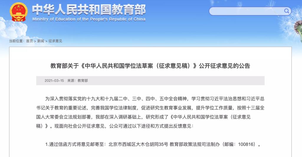 3月15日,教育部就《中华人民共和国学位法草案(征求意见稿)》(下称《草案》)公开征求意见。《草案》明确了学士、硕士、博士三级学位的授予条件、授予程序,并对学术不端问题的处理作出规定。