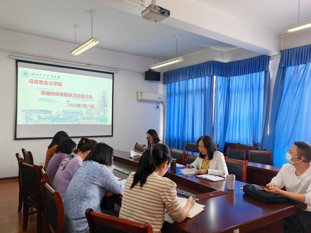 为进一步推进师德师风建设,落实立德树人根本任务,根据《湖北大学知行学院2024年党政工作要点》(校党发(2024) 1号)、《湖北大学知行学院压实师德师风建设主体责任的实施办法》(校发(2024) 5号)等文件要求,马克思主义学院组织全体教师开展师德师风专题学习,杨旭院长主持会议。