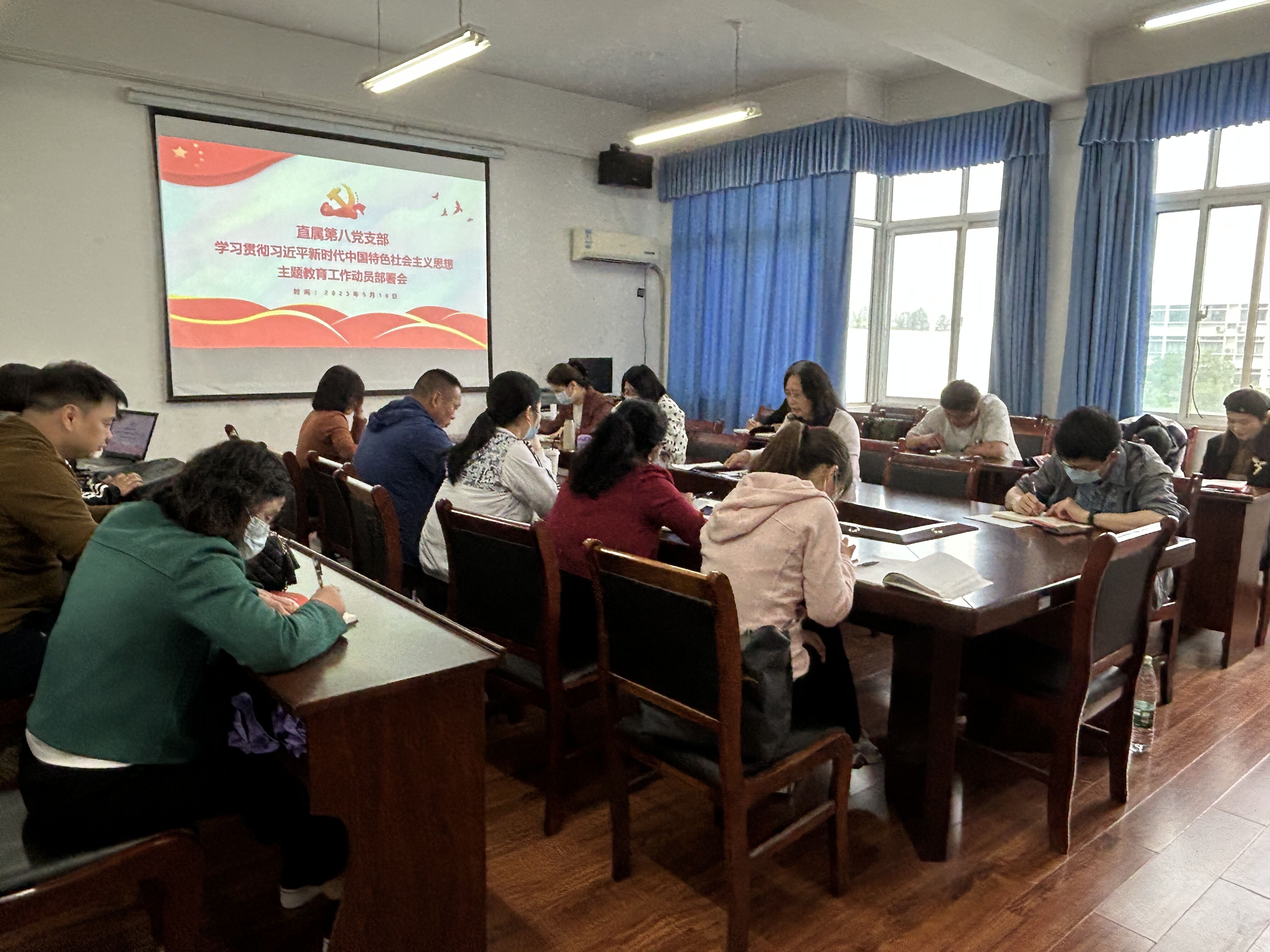 2023年5月10日下午,直属第八党支部在知远楼410会议室召开学习贯彻习近平新时代中国特色社会主义思想主题教育工作动员部署会。杨旭书记主持会议,全体党员老师参加会议。