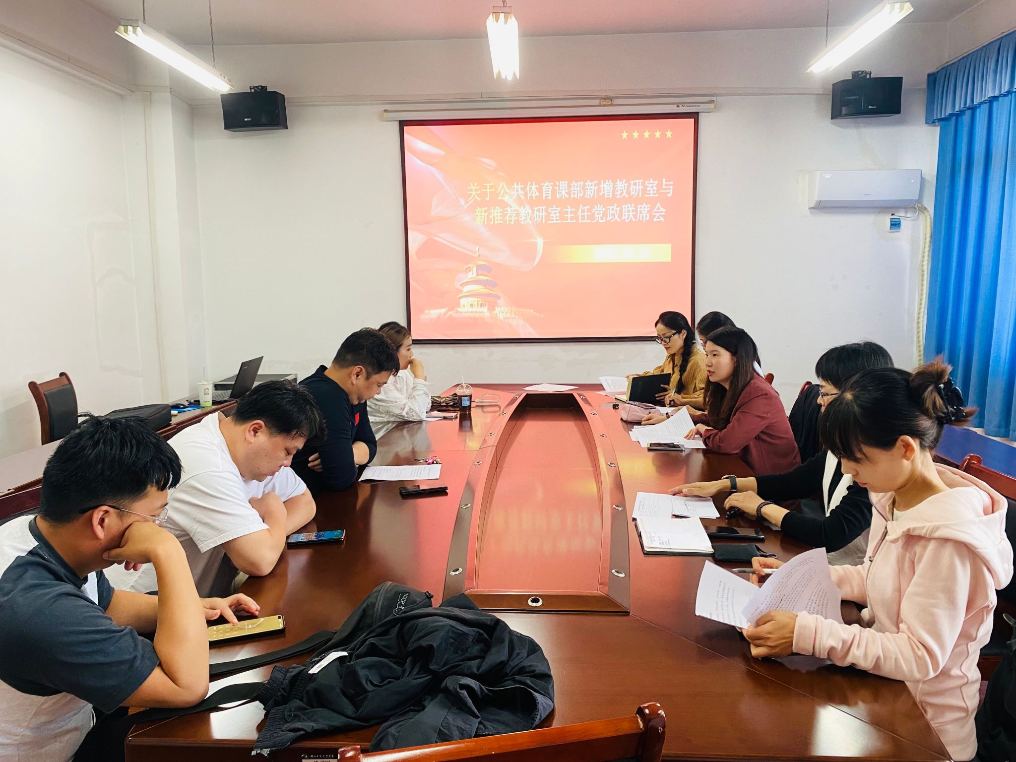 2025年10月15日,湖北大学知行学院直属第八党支部召开党政联席会议,专题审议公共体育课部关于调整部分教研室主任以及拟新增“学生体质健康教研室”的两项报告。新增教研室及2025年教研室主任调整相关事宜。会议由直属第八党支部书记胡正燕同志主持,体育课部副主任卢超、支部组织委员兼纪检委员刘霞、支部宣传委员王红梅、党员及群众代表共9人参会。