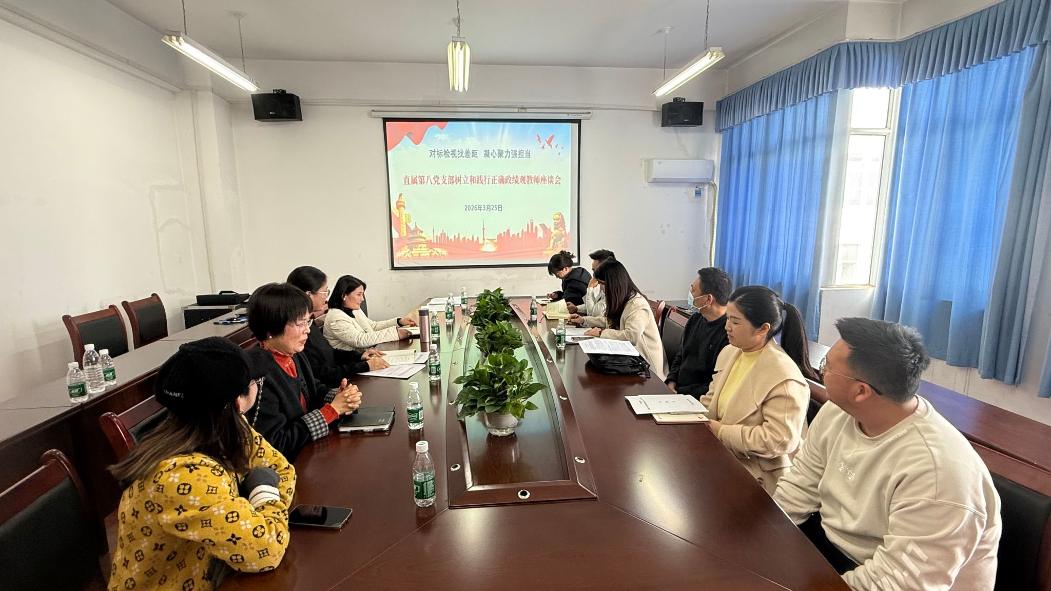为推动正确政绩观学习教育往深里走、往实里走,引导全体党员教师以刀刃向内的自我革命精神查摆问题、剖析根源、校准方向,2026年3月25日,直属第八党支部在知远楼410会议室召开树立和践行正确政绩观教师座谈会。会议由支部书记胡正燕主持,支部全体党员教师参会,重点围绕立党为公、为民造福、科学决策、真抓实干四大方面16项内容,全面开展对照检视与深度交流研讨。